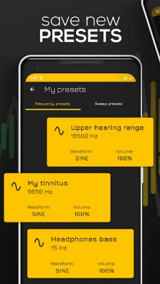 NOTE: Since mobile phones are not high-quality audio sources and in-built speakers may vary in quality, sometimes users can hear sounds at very low or high frequencies even beyond the scope of human hearing. That noise is not sound of a given frequency but static or “parasite” noise generated by your mobile device. For the best experience use a pair of good quality headphones.