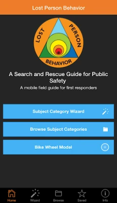 The app guides the user in selecting the correct subject category by several means. The subject category wizard allows the user to select potential scenarios and then will suggest the best match for the subject category. For example, if a child was riding his bicycle and was then known to be abducted, the user could select Child, Wheel/Motorized, and Abduction; the wizard would suggest using the abduction category. Alternately, the user can go straight to a subject category by using favorites, an alphabetical list, or the hierarchy list. Once the subject category is selected, the Lost Person Behavior App provides the user with: